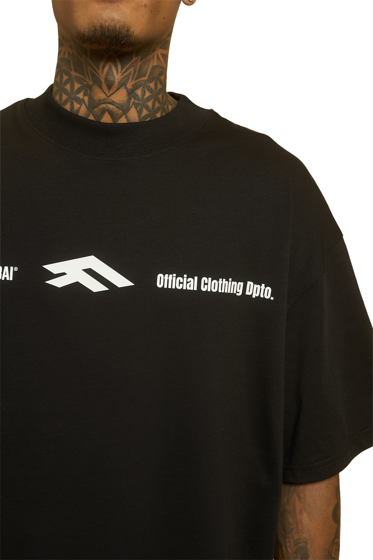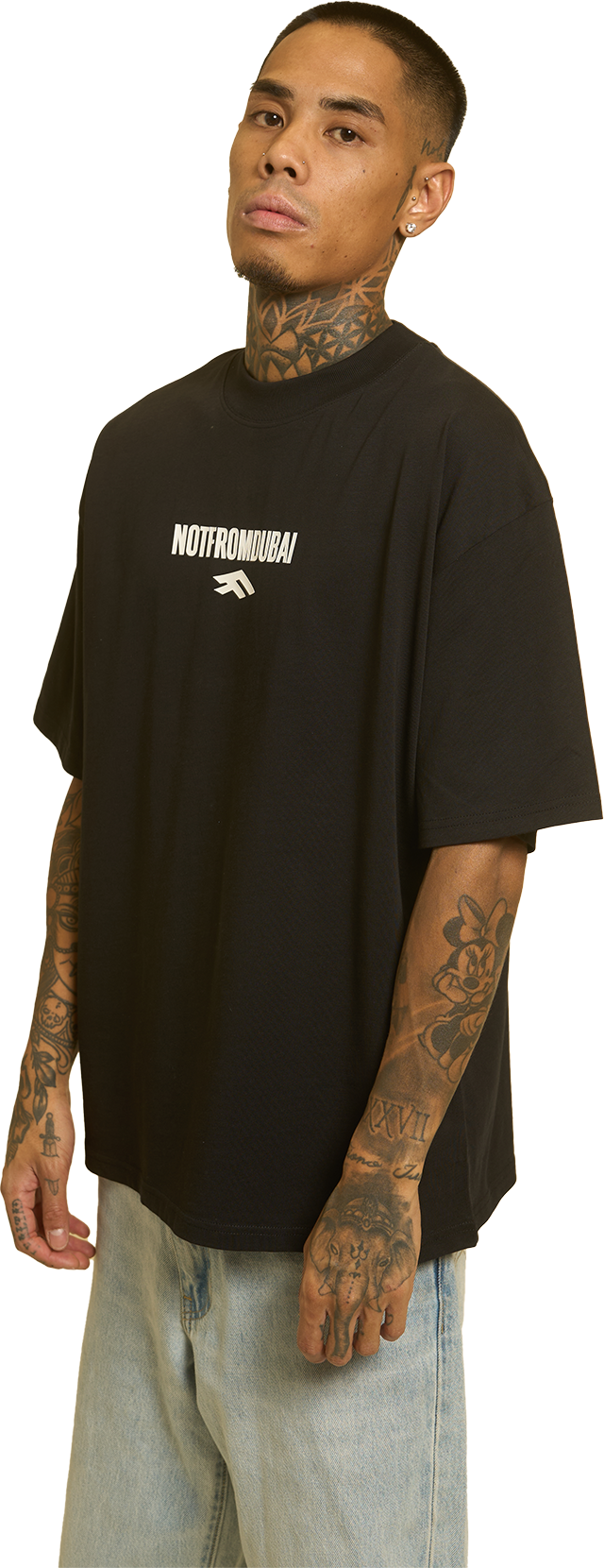 Camiseta de manga corta en color negro. Corte ligeramente oversize en algodón de peso medio. Cuello redondo de 3cm. Logotipo gráfico de NOTFROMDUBAI.