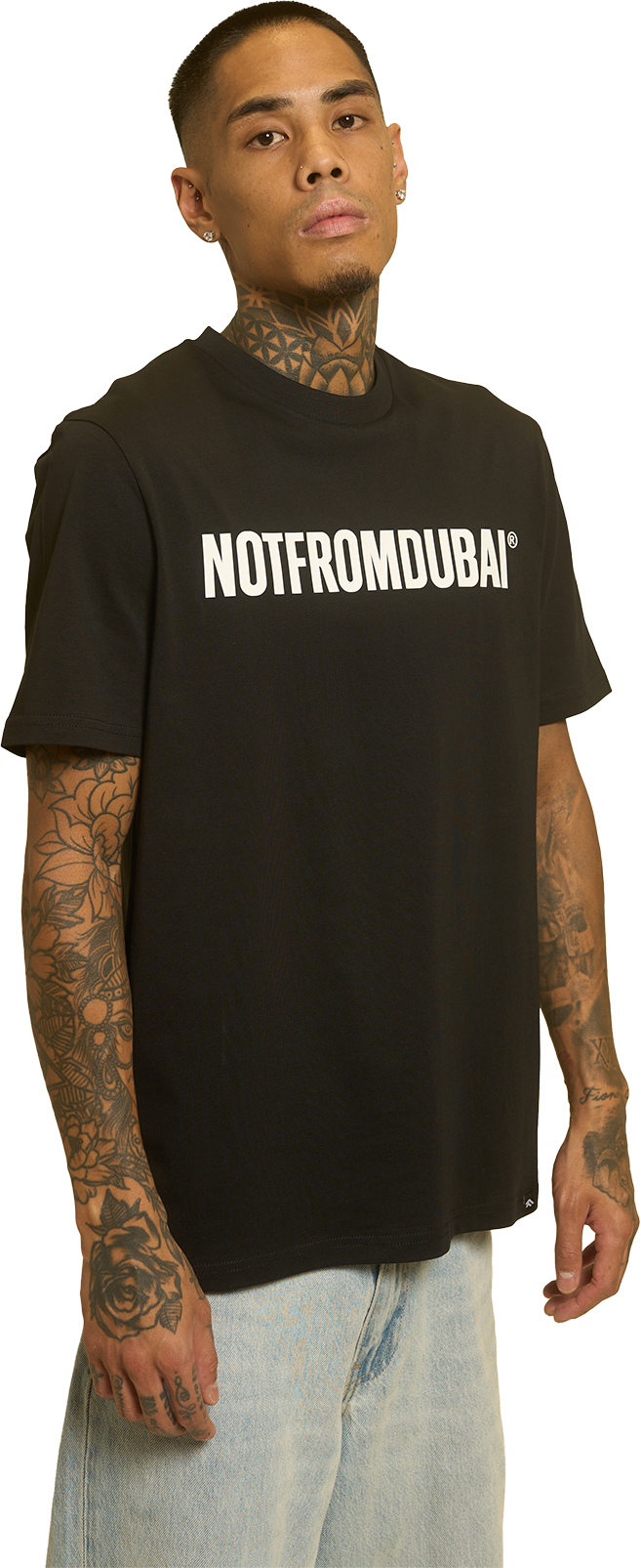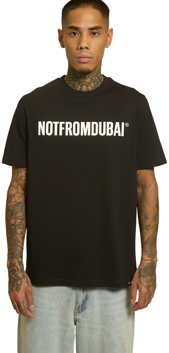 Camiseta de manga corta en color negro. Corte ligeramente oversize en algodón de peso medio. Cuello redondo de 3cm. Logotipo gráfico de NOTFROMDUBAI.